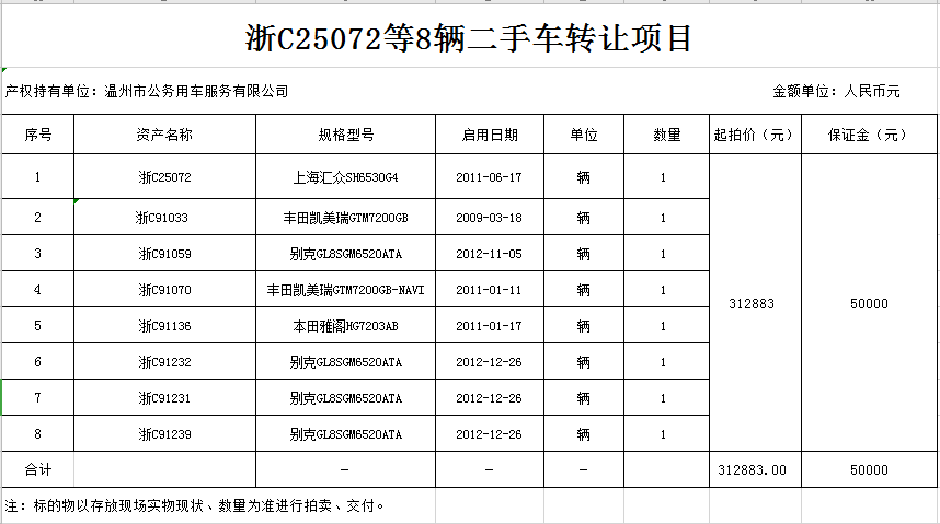 受委托,定于2021年09月03日下午3時,在溫州市天誠拍賣行拍賣廳,對牌號為 浙C25072等8輛二手車(捆綁式,不包括原牌照及商業(yè)保險),按現(xiàn)狀進行公開捆綁拍賣,起拍價312883元,車輛詳情見拍賣文件或溫州聯(lián)合產(chǎn)權(quán)交易中心有限公司網(wǎng)址(shvergs.cn)。