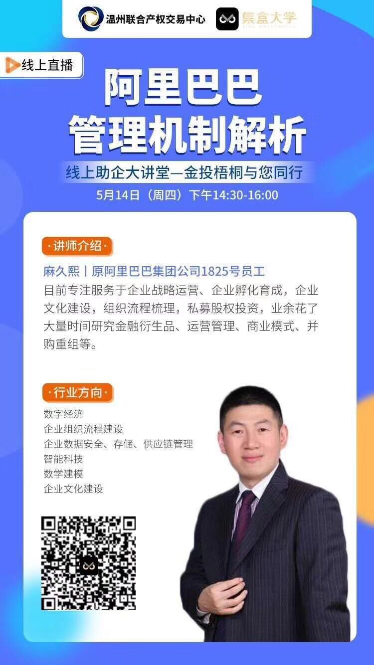 5月14日,溫州聯(lián)合產(chǎn)權(quán)交易中心順利開展了第六期暖企活動。本次活動特邀請一帶一路數(shù)字經(jīng)濟實驗室主任麻久熙老師,以線上直播的形式,為溫州地區(qū)數(shù)百家企業(yè)進行以“阿里巴巴管理機制解析”為主題的課程分享。
