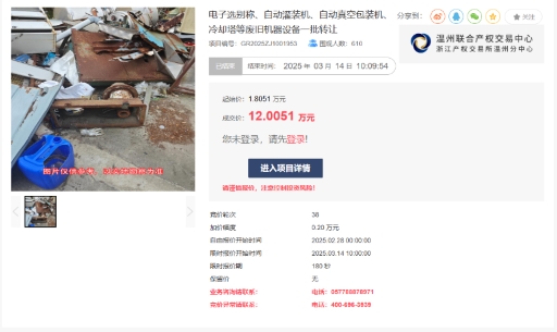 近日,溫州聯(lián)合產(chǎn)權(quán)交易中心成功助力浙江金海蘊(yùn)生物股份有限公司完成一批廢舊機(jī)器設(shè)備處置,以1.8萬元起拍價(jià)經(jīng)近40輪激烈競(jìng)價(jià),最終以12萬元成交,溢價(jià)率高達(dá)565.07%,創(chuàng)下平臺(tái)廢舊資產(chǎn)處置領(lǐng)域新紀(jì)錄。這一成績(jī)不僅彰顯了國(guó)有產(chǎn)權(quán)交易市場(chǎng)的活力,更成為“盤活存量資產(chǎn)、釋放資源價(jià)值”的典范案例。